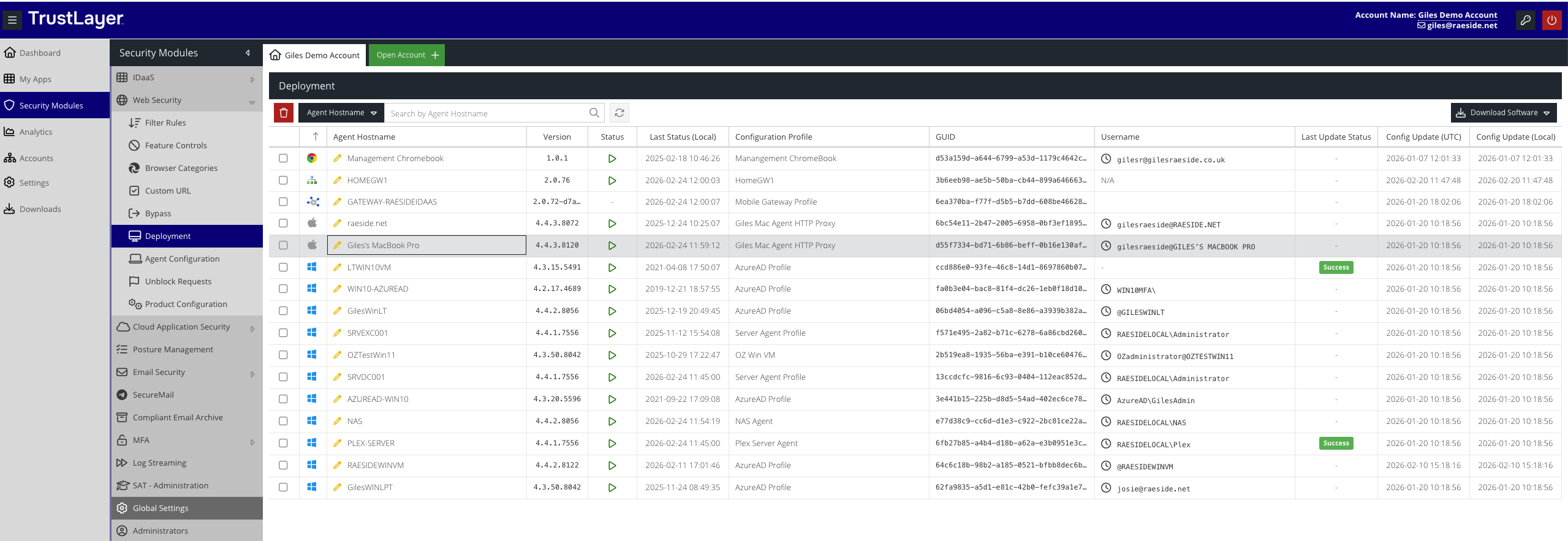 The Configuration Profile for the agent is managed via the Unified Security Service dashboard, in the Agent Configuration screen.