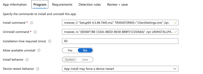 Ensure the Install command includes the MSI and MST commands and the Uninstall command includes the UNINSTALLPASSWORD value, then select the "Next" button.