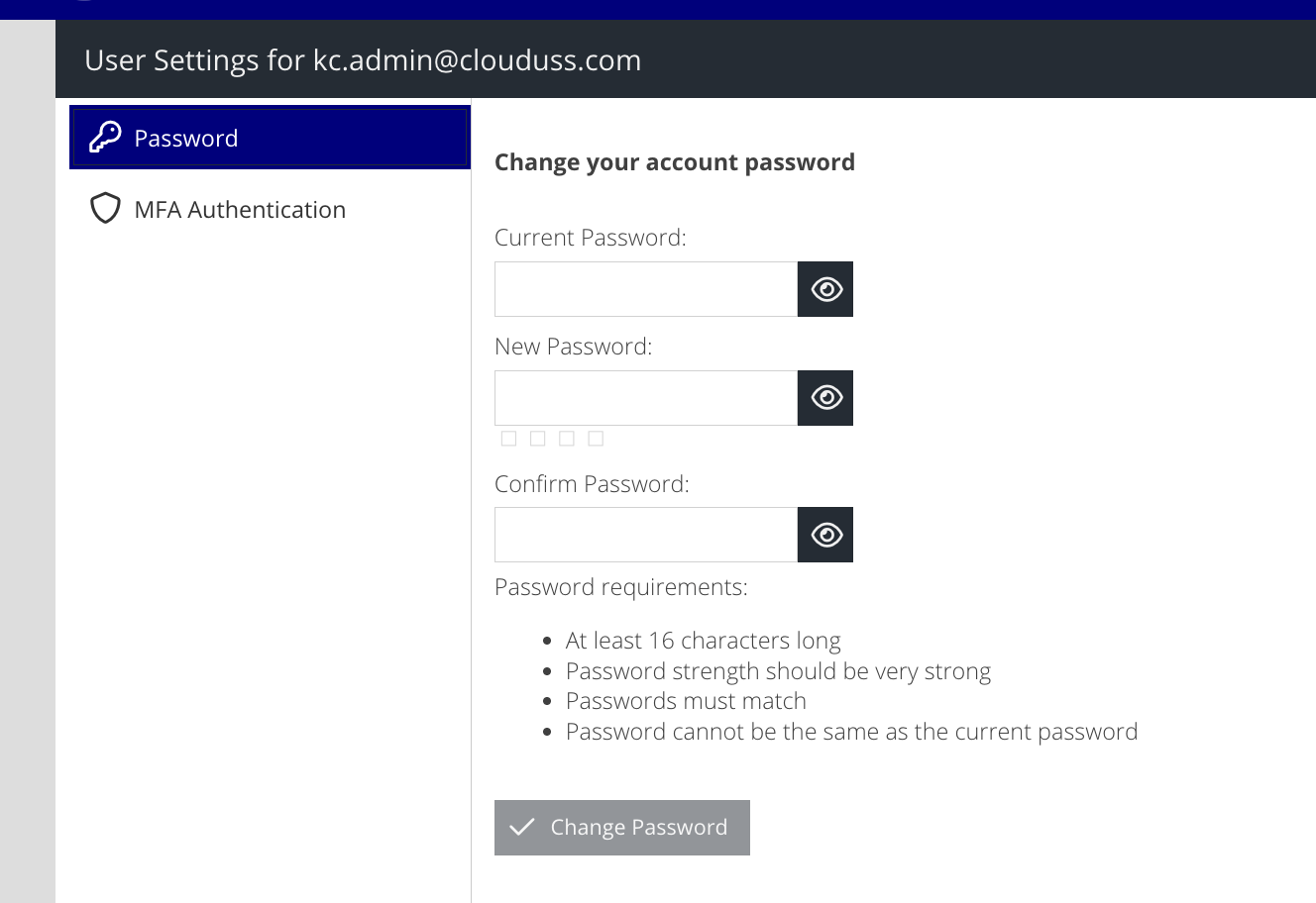 - Enter the new password and confirm it, then click Change Password. If you need to reveal the password, you can click the eye icon.